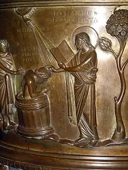 Renier de Huy serait le créateur de fonts baptismaux pour l'église Notre-Dame aux fonts (aujourd'hui disparue), un chef d’œuvre à dater entre les années 1107 et 1118[2],[3], commandé par l'abbé Hellinus. L'œuvre lui est attribuée par la chronique de Liège du XIVe siècle[4] ou du XVe siècle[a 1]. Les spécialistes contemporains, qui précisent qu'au XIIe siècle ce type de fondeur capable de couler des pièces complexes et de grande dimension ne se trouvait pas à Liège[5], contredisent cette attribution. L'œuvre massive comporte une cuve en laiton, supportée par douze bœufs (dont deux manquent aujourd'hui), représentant les douze apôtres[6]. Le couvercle de la cuve a disparu. La cuve a été moulée selon le procédé à la cire perdue[6]. La paroi extérieure de la cuve présente cinq scènes bibliques en haut-relief, a prédication de Jean-Baptiste et quatre scènes de baptême, ceux du Christ, des catéchumènes, du centurion romain Cornelius et du philosophe grec Craton. Les scènes, identifiées par des inscriptions[6], sont reliées par une base continue et séparées les unes des autres par des arbres stylisés. Le couvercle, vraisemblablement conique, orné de représentations des apôtres et des prophètes, a disparu, probablement dérobé par les révolutionnaires français, à la fin du XVIIIe siècle. La partie conservée, mise à l'abri à l'époque, a échappé au pillage[6].