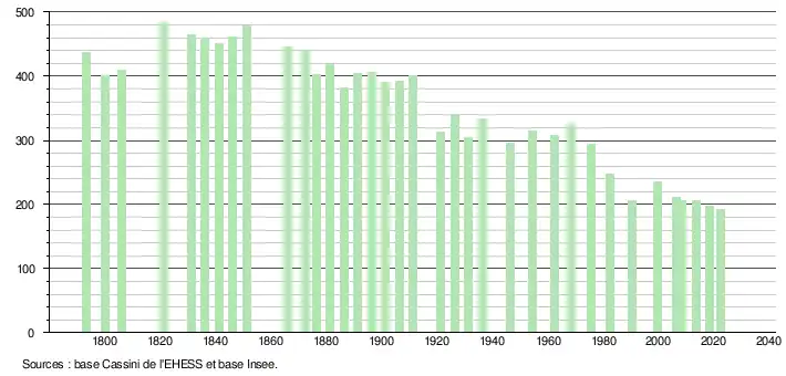 L'évolution du nombre d'habitants est connue à travers les recensements de la population effectués dans la commune depuis 1793. Pour les communes de moins de 10 000 habitants, une enquête de recensement portant sur toute la population est réalisée tous les cinq ans, les populations de référence des années intermédiaires étant quant à elles estimées par interpolation ou extrapolation[22]. Pour la commune, le premier recensement exhaustif entrant dans le cadre du nouveau dispositif a été réalisé en 2008[23].