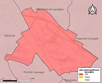 Le retrait-gonflement des sols argileux est susceptible d'engendrer des dommages importants aux bâtiments en cas d’alternance de périodes de sécheresse et de pluie. La totalité de la commune est en aléa moyen ou fort (88,8 % au niveau départemental et 48,5 % au niveau national). Sur les 219 bâtiments dénombrés sur la commune en 2019, 219 sont en aléa moyen ou fort, soit 100 %, à comparer aux 98 % au niveau départemental et 54 % au niveau national. Une cartographie de l'exposition du territoire national au retrait gonflement des sols argileux est disponible sur le site du BRGM[26],[Carte 3].