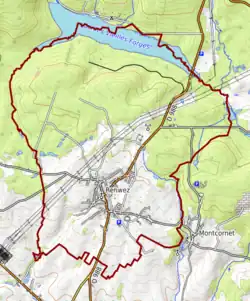 L'occupation des sols de la commune, telle qu'elle ressort de la base de données européenne d’occupation biophysique des sols Corine Land Cover (CLC), est marquée par l'importance des forêts et milieux semi-naturels (53,3 % en 2018), une proportion sensiblement équivalente à celle de 1990 (53 %). La répartition détaillée en 2018 est la suivante : forêts (49,3 %), prairies (30 %), terres arables (5,9 %), zones urbanisées (5,4 %), eaux continentales[Note 3] (5,2 %), milieux à végétation arbustive et/ou herbacée (4 %), espaces verts artificialisés, non agricoles (0,2 %)[17]. L'évolution de l’occupation des sols de la commune et de ses infrastructures peut être observée sur les différentes représentations cartographiques du territoire : la carte de Cassini (XVIIIe siècle), la carte d'état-major (1820-1866) et les cartes ou photos aériennes de l'IGN pour la période actuelle (1950 à aujourd'hui)[Carte 2].