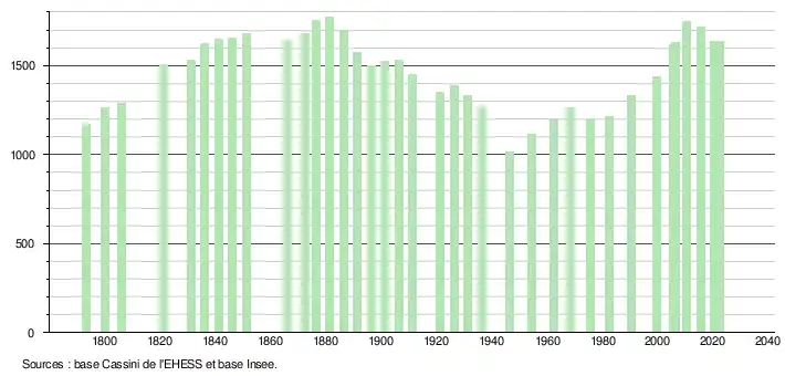 L'évolution du nombre d'habitants est connue à travers les recensements de la population effectués dans la commune depuis 1793. Pour les communes de moins de 10 000 habitants, une enquête de recensement portant sur toute la population est réalisée tous les cinq ans, les populations de référence des années intermédiaires étant quant à elles estimées par interpolation ou extrapolation[32]. Pour la commune, le premier recensement exhaustif entrant dans le cadre du nouveau dispositif a été réalisé en 2005[33].