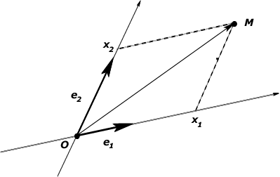 Tout point de , est repéré par ses coordonnées cartésiennes dans le repère : ce sont les coordonnées du vecteur dans la base de . Quand est de dimension finie n la base s'écrit et on a :