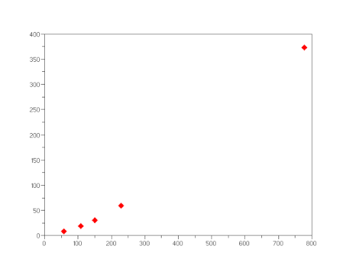 La même série de données en repère cartésien, aurait conduit à un tassement des premiers points pour permettre le placement du dernier point et aurait montré des points se plaçant vaguement sur une courbe polynomiale.