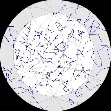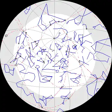 | Ciel nocturne représenté pour un observateur couché sur le dos. Le zénith est au centre de l'image. Pour observer l'horizon dans une direction donnée: tourner l'image jusqu'à ce que la direction d'observation soit en bas, sous le zénith. | ||