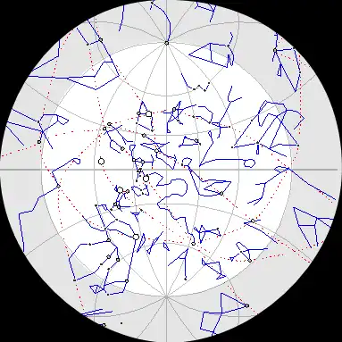 | Ciel nocturne représenté pour un observateur couché sur le dos. Le zénith est au centre de l'image. Pour observer l'horizon dans une direction donnée: tourner l'image jusqu'à ce que la direction d'observation soit en bas, sous le zénith. | ||