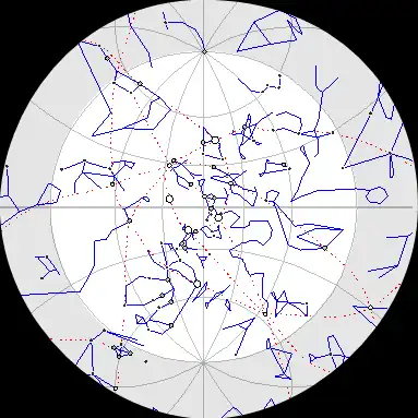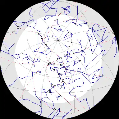 | Ciel nocturne représenté pour un observateur couché sur le dos. Le zénith est au centre de l'image. Pour observer l'horizon dans une direction donnée: tourner l'image jusqu'à ce que la direction d'observation soit en bas, sous le zénith. | ||