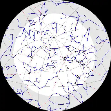 | Ciel nocturne représenté pour un observateur couché sur le dos. Le zénith est au centre de l'image. Pour observer l'horizon dans une direction donnée: tourner l'image jusqu'à ce que la direction d'observation soit en bas, sous le zénith. | ||