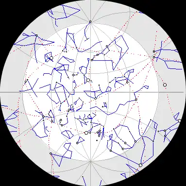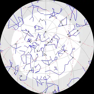 | Ciel nocturne représenté pour un observateur couché sur le dos. Le zénith est au centre de l'image. Pour observer l'horizon dans une direction donnée: tourner l'image jusqu'à ce que la direction d'observation soit en bas, sous le zénith. | ||