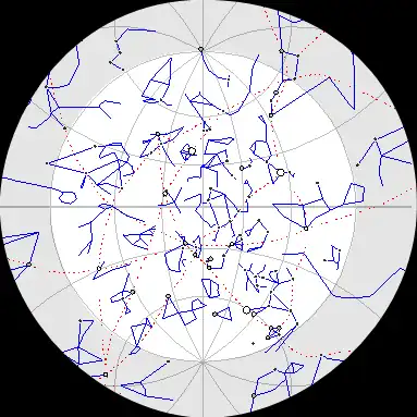 | Ciel nocturne représenté pour un observateur couché sur le dos. Le zénith est au centre de l'image. Pour observer l'horizon dans une direction donnée: tourner l'image jusqu'à ce que la direction d'observation soit en bas, sous le zénith. | ||