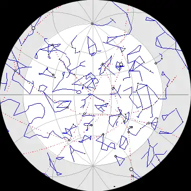 | Ciel nocturne représenté pour un observateur couché sur le dos. Le zénith est au centre de l'image. Pour observer l'horizon dans une direction donnée: tourner l'image jusqu'à ce que la direction d'observation soit en bas, sous le zénith. | ||