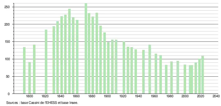 L'évolution du nombre d'habitants est connue à travers les recensements de la population effectués dans la commune depuis 1793. Pour les communes de moins de 10 000 habitants, une enquête de recensement portant sur toute la population est réalisée tous les cinq ans, les populations de référence des années intermédiaires étant quant à elles estimées par interpolation ou extrapolation[25]. Pour la commune, le premier recensement exhaustif entrant dans le cadre du nouveau dispositif a été réalisé en 2008[26].
