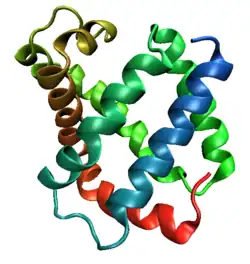 Le repliement globine est un mode de repliement courant dans les protéines de la famille des globines ainsi que de la superfamille des protéines qui leur sont homologues. Il consiste généralement en une structure tridimensionnelle comprenant huit hélices α, bien que certaines protéines ajoutent quelques hélices supplémentaires à leurs extrémités[1]. On observe ce repliement dans les hémoglobines, les myoglobines ainsi que les phycocyanines. Ce fut le premier repliement protéique identifié, car la myoglobine a été la première protéine dont la structure tridimensionnelle a été résolue. Dans la mesure où cette structure ne contient que des hélices α, elle est classée comme repliement tout-α (en). Dans le cas des globines, les hélices α délimitent une cavité dans laquelle s'insère l'hème, qui est leur groupe prosthétique.