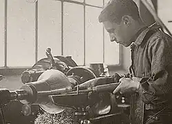 La déformation s’effectue sur un tour spécial, de la même forme et simplicité que le tour à bois. Cette pratique ancienne est au stade artisanal.