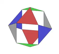 On peut également visualiser ce groupe de rotations comme celui du cuboctaèdre, puisque c'est le cube rectifié (en) : les milieux d'arêtes du cube deviennent les sommets du cuboctaèdre, les huit coins du cube sont coupés et remplacés par des faces triangulaires, et les rotations permutent alors les quatre paires de triangles opposés.
