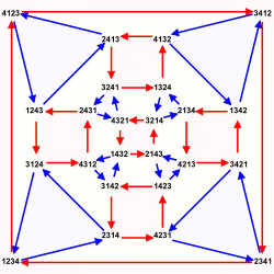 Elle n'est pas fidèle et chaque isométrie du triangle possède quatre antécédents. La figure de droite illustre cette représentation. On a nommé les trois sommets du triangle au moyen des trois étiquettes 1×2 + 3×4, 2×3 + 1×4 et 1×3 + 2×4. Une permutation de S4 agit directement sur les chiffres de chaque étiquette. Ainsi, la transposition (12) laisse le sommet 1×2 + 3×4 invariant mais permute les deux sommets 2×3 + 1×4 et 1×3 + 2×4. On pourra vérifier que l'action de cette transposition est identique à celle de la transposition (34) ou celle des permutations circulaires (1324) ou (1423). Une telle action du groupe S4 est utilisée pour résoudre les équations du quatrième degré.