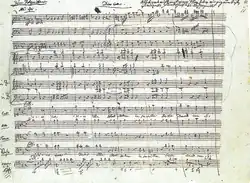 Première page de la « partition à livrer » avec l'écriture de Mozart. La signature « di me W. A. Mozart mppr. 1792 » (di me = « de moi », mppr. = manu propria, « de ma propre main »), est de la main de Süßmayr selon des analyses d'écritures. De toute manière en 1792 Mozart était déjà mort.