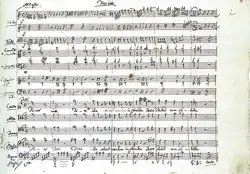 Manuscrit original du Requiem : les cinq premières mesures du Lacrimosa dans la « partition de travail ». En haut à gauche, les parties des cordes de l'introduction, en bas à droite le début de la phrase vocale et du continuo, tous deux de la main de Mozart.