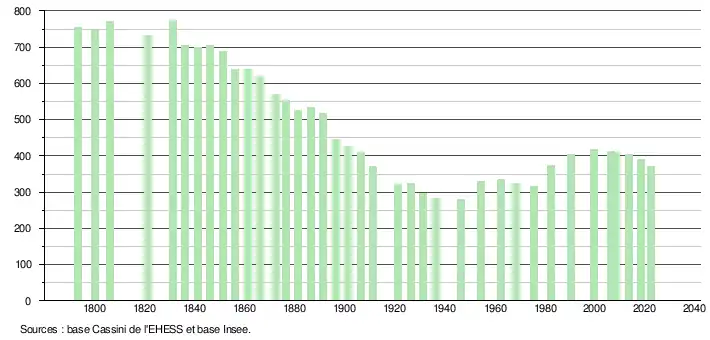 L'évolution du nombre d'habitants est connue à travers les recensements de la population effectués dans la commune depuis 1793. Pour les communes de moins de 10 000 habitants, une enquête de recensement portant sur toute la population est réalisée tous les cinq ans, les populations de référence des années intermédiaires étant quant à elles estimées par interpolation ou extrapolation[17]. Pour la commune, le premier recensement exhaustif entrant dans le cadre du nouveau dispositif a été réalisé en 2008[18].