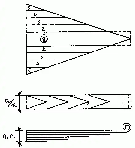 Après avoir découpé la lame triangulaire comme indiqué ci-après, « ressoudé » les morceaux latéraux deux à deux, élargi la lame la plus longue (lame maîtresse), il est possible de rassembler les lames élémentaires pour former un système étagé supposé équivalent au précédent.
