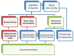 Keqin Hu, président de Ressources Investment, est également à la tête de Reward Group (connu sous Luowa en Chine)[1], une société chinoise fondée en 1995 qui s'est progressivement diversifiée en trois branches d'activité : les produits ménagers, l'immobilier et l'alimentaire avec notamment la commercialisation du lait en poudre. À la suite d'un scandale alimentaire concernant le lait en Chine, le groupe, pour se diversifier et redonner confiance aux consommateurs dans la qualité de ses produits, décide de s'approvisionner dans des pays dont les normes appliquées sont reconnues. La qualité de la production française et l'attrait de son foncier conduisent le milliardaire Keqin Hu à investir dans des exploitations céréalières en France. Le but est d'expédier la farine produite pour permettre d'alimenter une future chaine composée de 1 500 boulangeries.