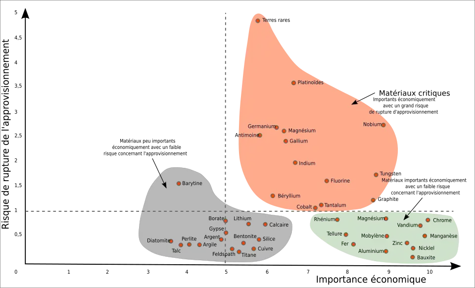 - les matériaux critiques sont ceux dont le risque d'approvisionnement est principalement dû au fait que la majeure partie de la production mondiale provient de Chine, de Russie, de la République démocratique du Congo et du Brésil. Cette concentration de la production repose, dans la plupart des cas, sur le manque de substitutabilité et du faible taux de recyclage.