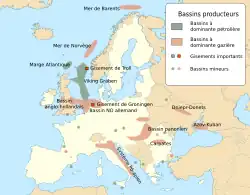 Les États membres de l'Union européenne disposent de quelques gisements pétroliers dont la majeure partie se trouve en mer du Nord[17]. Le bassin de Viking Graben et la région de Tampen sont les principales sources de pétrole du Royaume-Uni. Il s'agit d'une région pétrolière et gazière d'importance mondiale, mais qui a franchi le pic de production. Les ressources sont partagées presque à égalité avec la Norvège[17]. Une poignée de gisements géants (Brent, Ninian, Piper, Forties) de cette zone créèrent un véritable boom de la production dans les années 1980[17]. Au nord du Royaume-Uni se trouve aussi la « marge Atlantique », une région pétrolière plus récente, où sont exploités deux principaux gisements, Foinaven et Schiehallion, qui comptent parmi les plus gros producteurs britanniques[17]. En dehors de ces zones, les réserves de pétrole ont une taille négligeable. De petites réserves existent : au sud-est de la Grande-Bretagne ; dans le Bassin parisien ; dans les landes de Gascogne ; au large des côtes espagnoles ; dans le sud de la Sicile ; ainsi que de petits gisements en Hongrie, et Grèce[17].