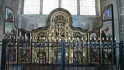 Retable avec la caisse centrale à décor sculpté et deux volets à décor peint. La huche est divisée en trois champs par des colonnettes à pinacles, reliées par des gâbles à rinceaux ajourés.