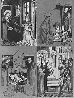 Sur un panneau latéral, quatre scènes de l'histoire sainte sont peintes sur les panneaux latéraux : un panneau représente l'Annonciation, entièrement conservé et à la National Gallery, un deuxième la Nativité dont il ne reste que les cinq beaux anges, et la tête de Joseph, au Landesmuseum à Münster. De l'Adoration des mages ne subsistent que les rois. Le fragment montrant l'enfant et un roi est à la National Gallery, les têtes des deux autres rois sont au LWL- Landesmuseum à Münster. La Présentation de Jésus au Temple est complète et est à la National Gallery. Deux panneaux latéraux du retable sont attribués à Jan Baegert.