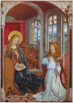 Parmi les panneaux du maître, l'annonciation représente, comme d'usage, une double espace, à plafond est vouté. la pièce avant est montré comme un oratoire, la pièce arrière comme une chambre à coucher. Le sol est carrelé de carreaux aux motifs élaborés, des rideaux rouges entourent le lit; le petit meuble et la banquette portent divers accessoires. Sur les murs deux statues de prophètes à l'avant, et une du Christ portant le globe. Les fenêtres donnent sur un paysage vallonné avec un manoir entouré d'une muraille. Les impostes portent des écussons. La Vierge est agenouillée devant un prie-dieu au décor raffiné, le livre ouvert sur les genoux. Elle porte un manteau bleu sur une robe en brocart doré, et tourne sa tête vers l'ange lui aussi richement vêtu, avec dans sa main gauche un sceptre autour duquel s'enroule une banderole contenant le salut. Ces détails sont d'une précision caractéristique de la peinture rhénane et hollandaise de cette période.
