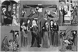 Le retable est de taille importante : l'Annonciation, qui ne couvre que le quart de l'un des deux panneaux, mesure 98,7 × 70,5 cm, ce qui fait, pour le panneau entier, environ 200 × 140 cm. Le retable - tel que l'on peut l'imaginer par les morceaux que l'on connaît - n'a pas deux ailes rabattables comme habituellement, par exemple sur le retable de l’église de Lünen, mais au contraire présente les tableaux alignés les uns à côté des autres. Dans le centre, une Crucifixion, dont l'historien d'art Paul Pieper (de) propose la reconstruction suivante[3] : D'un côté de la croix Marie, avec les saints Côme et Damien, et de l’autre l'apôtre Jean, sainte Scolastique et saint Benoît. Quatre anges recueillent le sang qui goutte des blessures. La tête du Christ est préservée, comme les bustes des saints, divers anges avec des calices en or. Le panneau a été découpé, et n'ont été gardés que la tête du Christ, les quatre anges, et les deux groupes de trois personnes, réduits aux bustes. La tête et les groupes de personnes sont à la National Gallery de Londres, les quatre têtes d'anges sont conservés au LWL-Landesmuseum de Münster.