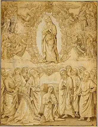 Le Pérugin fait largement appel à des dessins de son répertoire réadaptés pour l'occasion. La composition sur deux registres avec la mandorle est issue de l'Assomption de la Chapelle Sixtine (perdue) reproduite à de nombreuses occasions dans les retables. La division en deux parties est ici fortement marquée par le faisceau horizontal de nuages qui coupe la mandorle afin d'éviter une trop forte rigidité géométrique. Un autre exemple d'influence directe est constitué par la Transfiguration de la Sala delle Udienze del Collegio del Cambio à Pérouse.