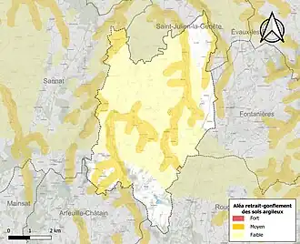 Le retrait-gonflement des sols argileux est susceptible d'engendrer des dommages importants aux bâtiments en cas d’alternance de périodes de sécheresse et de pluie. 30,5 % de la superficie communale est en aléa moyen ou fort (33,6 % au niveau départemental et 48,5 % au niveau national). Sur les 200 bâtiments dénombrés sur la commune en 2019, 74 sont en aléa moyen ou fort, soit 37 %, à comparer aux 25 % au niveau départemental et 54 % au niveau national. Une cartographie de l'exposition du territoire national au retrait gonflement des sols argileux est disponible sur le site du BRGM[15],[Carte 2].