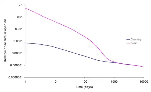 Comme indiqué plus haut, l'activité du nuage produit par une explosion atomique décroit initialement en t-1,2, c'est-à-dire que quand le temps depuis l'explosion est multiplié par sept, la radioactivité décroît d'un facteur dix[12].