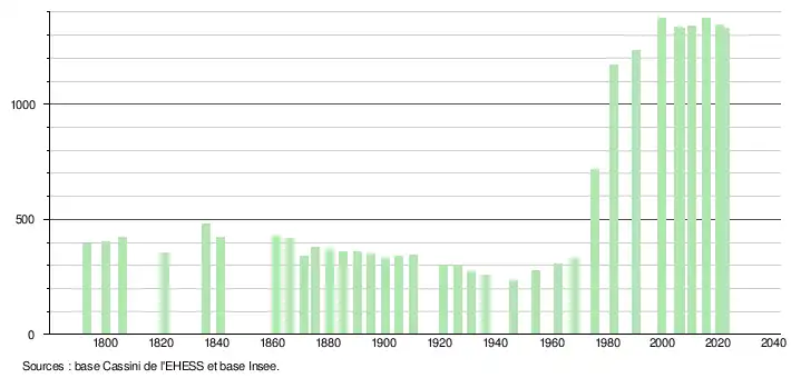 L'évolution du nombre d'habitants est connue à travers les recensements de la population effectués dans la commune depuis 1793. Pour les communes de moins de 10 000 habitants, une enquête de recensement portant sur toute la population est réalisée tous les cinq ans, les populations de référence des années intermédiaires étant quant à elles estimées par interpolation ou extrapolation[19]. Pour la commune, le premier recensement exhaustif entrant dans le cadre du nouveau dispositif a été réalisé en 2005[20].