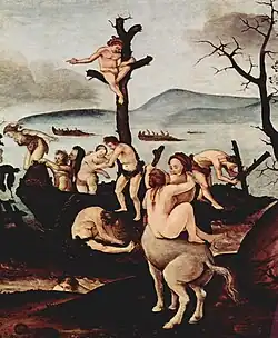 La scène montre un groupe d'hommes primitifs, vêtus de peaux, revenant d'une chasse, sur fond d'un grand lac, sur lequel naviguent des bateaux. À gauche, un homme dépose un sanglier tué qu'il portait sur ses épaules et un bœuf mort gît à côté de lui. Sur un bateau, décoré de branches et de têtes de loups, se trouve un couple et un homme qui charge des proies mortes à l'avant. Dans le bateau suivant, plus encombré, un homme hissé sur le mât indique la direction, tandis que quelques femmes, aidées par des hommes, débarquent ou sautent dans l'eau ; un homme place deux piquets sur la poupe à l'aide d'une corde, seul moyen d'assemblage à ce stade de l'humanité. Pendant ce temps au premier plan, à droite, une femme séduit un centaure alors qu'elle est sur son dos.
