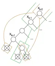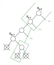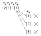| Un exemple dans lequel l’affectation partielle courante de a été essayée sans succès pour toutes les valeurs possibles de . Le retour sur trace revient sur , en essayant de lui attribuer une nouvelle valeur. | Au lieu de retourner au niveau encore supérieur, l’algorithme élabore en démontrant qu’aucune des affectations , , et | En conséquence, l’affectation de ne conduit jamais à une solution non plus. L’algorithme revient alors directement à , en tentant de lui affecter une nouvelle valeur. |