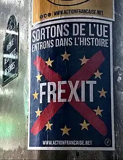 D'autres partis d'extrême-droite proches du Rassemblement National continuent à soutenir l'idée d'un Frexit comme l'Action française. Présentant une liste aux européennes de 2014 et de 2019, l'Alliance royale s'oppose également à l'appartenance de la France à l'Union européenne[22].