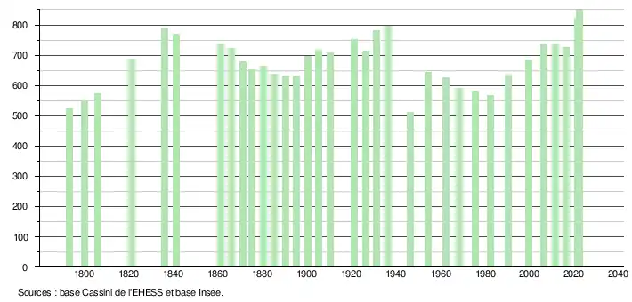 L'évolution du nombre d'habitants est connue à travers les recensements de la population effectués dans la commune depuis 1793. Pour les communes de moins de 10 000 habitants, une enquête de recensement portant sur toute la population est réalisée tous les cinq ans, les populations de référence des années intermédiaires étant quant à elles estimées par interpolation ou extrapolation[17]. Pour la commune, le premier recensement exhaustif entrant dans le cadre du nouveau dispositif a été réalisé en 2006[18].