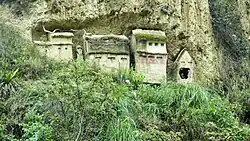 Les murs des mausolées ont été surélevés par des pierres posées sur du mortier de boue. Chacun comporte un "rez de chaussée" rectangulaire et un ou deux étages. Au lieu d'une porte d'entrée, ils ont des portes latérales. Ils sont souvent fixés latéralement aux murs de séparation ou utilisent un mur mitoyen. L'arrière n'a pas de mur, puisque les mausolées ont été construits contre le rocher.