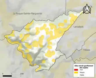 La commune est vulnérable au risque de mouvements de terrains constitué principalement du retrait-gonflement des sols argileux[21]. Cet aléa est susceptible d'engendrer des dommages importants aux bâtiments en cas d’alternance de périodes de sécheresse et de pluie. 38,7 % de la superficie communale est en aléa moyen ou fort (67,5 % au niveau départemental et 48,5 % au niveau national). Sur les 46 bâtiments dénombrés sur la commune en 2019, 32 sont en aléa moyen ou fort, soit 70 %, à comparer aux 90 % au niveau départemental et 54 % au niveau national. Une cartographie de l'exposition du territoire national au retrait gonflement des sols argileux est disponible sur le site du BRGM[22],[Carte 3].
