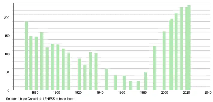 L'évolution du nombre d'habitants est connue à travers les recensements de la population effectués dans la commune depuis 1872. Pour les communes de moins de 10 000 habitants, une enquête de recensement portant sur toute la population est réalisée tous les cinq ans, les populations de référence des années intermédiaires étant quant à elles estimées par interpolation ou extrapolation[30]. Pour la commune, le premier recensement exhaustif entrant dans le cadre du nouveau dispositif a été réalisé en 2005[31].