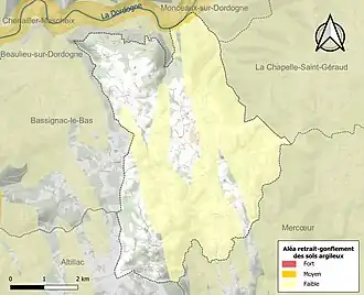 Le retrait-gonflement des sols argileux est susceptible d'engendrer des dommages importants aux bâtiments en cas d’alternance de périodes de sécheresse et de pluie. 0,4 % de la superficie communale est en aléa moyen ou fort (26,8 % au niveau départemental et 48,5 % au niveau national). Sur les 95 bâtiments dénombrés sur la commune en 2019, aucun n'est en aléa moyen ou fort, à comparer aux 36 % au niveau départemental et 54 % au niveau national. Une cartographie de l'exposition du territoire national au retrait gonflement des sols argileux est disponible sur le site du BRGM[17],[Carte 2].