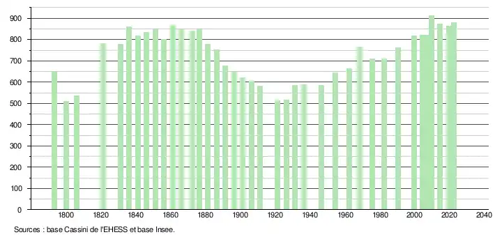 L'évolution du nombre d'habitants est connue à travers les recensements de la population effectués dans la commune depuis 1793. Pour les communes de moins de 10 000 habitants, une enquête de recensement portant sur toute la population est réalisée tous les cinq ans, les populations de référence des années intermédiaires étant quant à elles estimées par interpolation ou extrapolation[28]. Pour la commune, le premier recensement exhaustif entrant dans le cadre du nouveau dispositif a été réalisé en 2004[29].