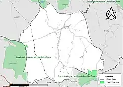 L’inventaire des zones naturelles d'intérêt écologique, faunistique et floristique (ZNIEFF) a pour objectif de réaliser une couverture des zones les plus intéressantes sur le plan écologique, essentiellement dans la perspective d’améliorer la connaissance du patrimoine naturel national et de fournir aux différents décideurs un outil d’aide à la prise en compte de l’environnement dans l’aménagement du territoire. Deux ZNIEFF de type 1[Note 1] sont recensées sur la commune[15] : les « bois et ancienne carrière de Puy blanc » (56 ha), couvrant 2 communes du département[16] et les « landes et pelouses sèches de la Terre » (179 ha), couvrant 3 communes du département[17].