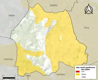 Le retrait-gonflement des sols argileux est susceptible d'engendrer des dommages importants aux bâtiments en cas d’alternance de périodes de sécheresse et de pluie. 63,8 % de la superficie communale est en aléa moyen ou fort (67,7 % au niveau départemental et 48,5 % au niveau national). Sur les 212 bâtiments dénombrés sur la commune en 2019, 125 sont en aléa moyen ou fort, soit 59 %, à comparer aux 72 % au niveau départemental et 54 % au niveau national. Une cartographie de l'exposition du territoire national au retrait gonflement des sols argileux est disponible sur le site du BRGM[26],[Carte 2].
