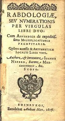 - 1617 - On doit à Neper la rédaction d'un ouvrage (Rabdologiae, publié en latin par Andreas Hart, à Édimbourg, en 1617, l'année de sa mort) qui explique comment graver les quatre faces de bâtonnets de section carrée et comment les juxtaposer pour lire directement les produits partiels d'une multiplication. Voir l'article Bâtons de Neper.