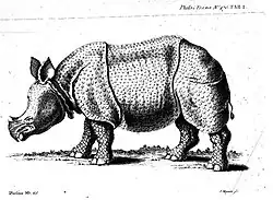 Rhinocéros indien. C'est le troisième de l'Europe moderne, un siècle après la mort du second. Ce rhinocéros, provenant dit-on de la Cour de Golconde, fut ramené par le capitaine Henry Udall à bord du Herbert, un navire de la Compagnie anglaise des Indes orientales. Il débarqua à Londres en janvier 1684 et fut aussitôt vendu pour 2000 livres à un entrepreneur privé pour être exposé à la Bartholomew Fair, ou à l’auberge de la Belle Sauvage de Ludgate Hill. Le public paye 1 shilling pour le voir, 2 shillings pour avoir le droit de le chevaucher. La Belle Sauvage encaissait jusqu'à 15 livres par jour. C'est le premier rhinocéros privatisé (et sans doute rentable) de l'histoire : depuis celui de Ptolémée II Philadelphe, en passant par tous les empereurs romains, jusqu'à celui de Philippe II d'Espagne, la possession d'un rhinocéros avait toujours été en Occident monopole royal ou impérial. Ce rhinocéros vécut à Londres près de deux ans et demi, et mourut en 1686.