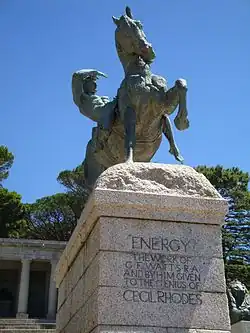 Une statue équestre symbolisant l'énergie, sculptée par George Frederic Watts et située à la base du mémorial, rend hommage au dynamisme et la détermination de Rhodes. À l'origine, elle devait être érigée à Victoria Falls en Rhodésie du Sud. Une version identique a été érigée dans les Kensington Gardens à Londres et une autre, située autrefois à Lusaka, est exposée aux archives nationales du Zimbabwe[1].
