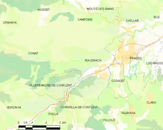 Les communes les plus proches[Note 1] sont[3] : Codalet (1,4 km), Prades (2,1 km), Catllar (3,4 km), Villefranche-de-Conflent (3,5 km), Conat (3,6 km), Taurinya (3,8 km), Clara (4,4 km), Corneilla-de-Conflent (4,9 km).