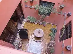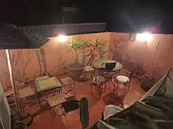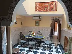 Les riads s'organisent autour d'un patio - salon / - salle à manger central[9], comme base d'une structure architecturale en forme de puits de jour étagé en balcons tournés sur l’intérieur, inspirée de l'habitat arabo-andalou traditionnel, de l'héritage persan et de l'héritage romain (atrium d'habitation de la Rome antique).
